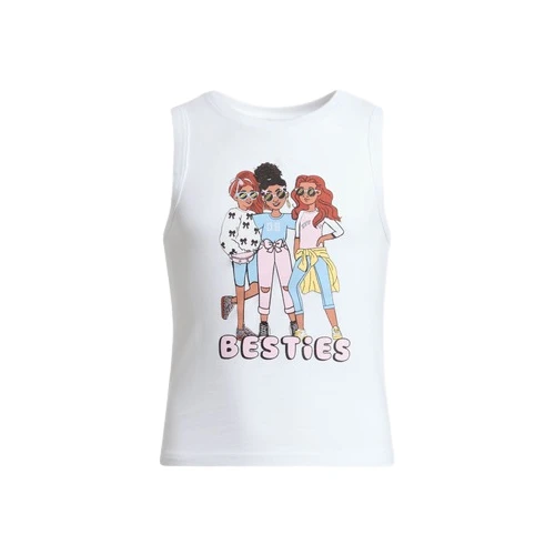 Girls’ White “Besties” Graphic Sleeveless Top Celebrate friendship and fun style with this Girls’ White “Besties” Graphic Sleeveless Top. Made from a soft and breathable cotton blend, this top offers all-day comfort and a relaxed fit perfect for warm weather. The front features a colorful print of three stylish friends with the word “Besties” in bold pastel letters, adding a playful and trendy touch. Ideal for pairing with jeans, shorts, or skirts, this sleeveless top is perfect for casual outings, playdates, or everyday wear. |