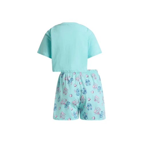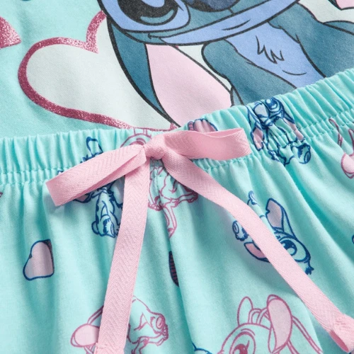 Kid’s Blue “So Sleepy Stitch” Two-Piece Pyjama Set Get cozy in Disney style with this Women’s Blue “So Sleepy Stitch” Two-Piece Pyjama Set. Made from soft, breathable cotton fabric, this adorable sleepwear set includes a cropped short-sleeve top featuring a cute Stitch print with the phrase “So Sleepy,” and matching shorts decorated with playful Stitch and heart patterns. The shorts come with an elastic waistband and a pink drawstring for a comfortable, adjustable fit. Perfect for lounging or bedtime, this pajama set combines comfort, cuteness, and a touch of Disney magic. |